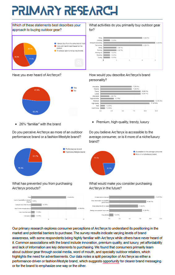 The project combined secondary research, consumer surveys, and competitive analysis to assess Arc’teryx’s current market standing. It analyzed the intersection between the brand’s innovation-driven heritage and its recent rise in fashion and streetwear culture, identifying how these dual identities shape consumer perceptions.